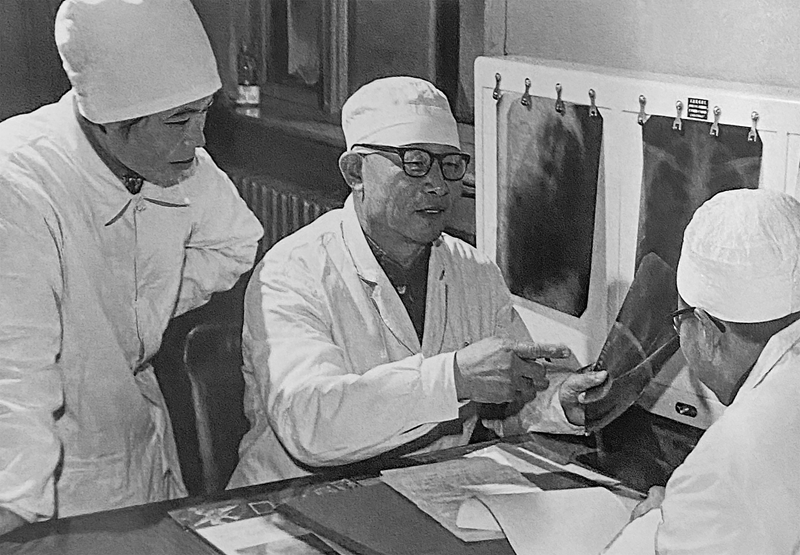 1980年1月16日,中日友好医院首任院长辛育龄(中)在内蒙古结核病院与胸外科医师讨论病例(翻拍照片)。新华社发