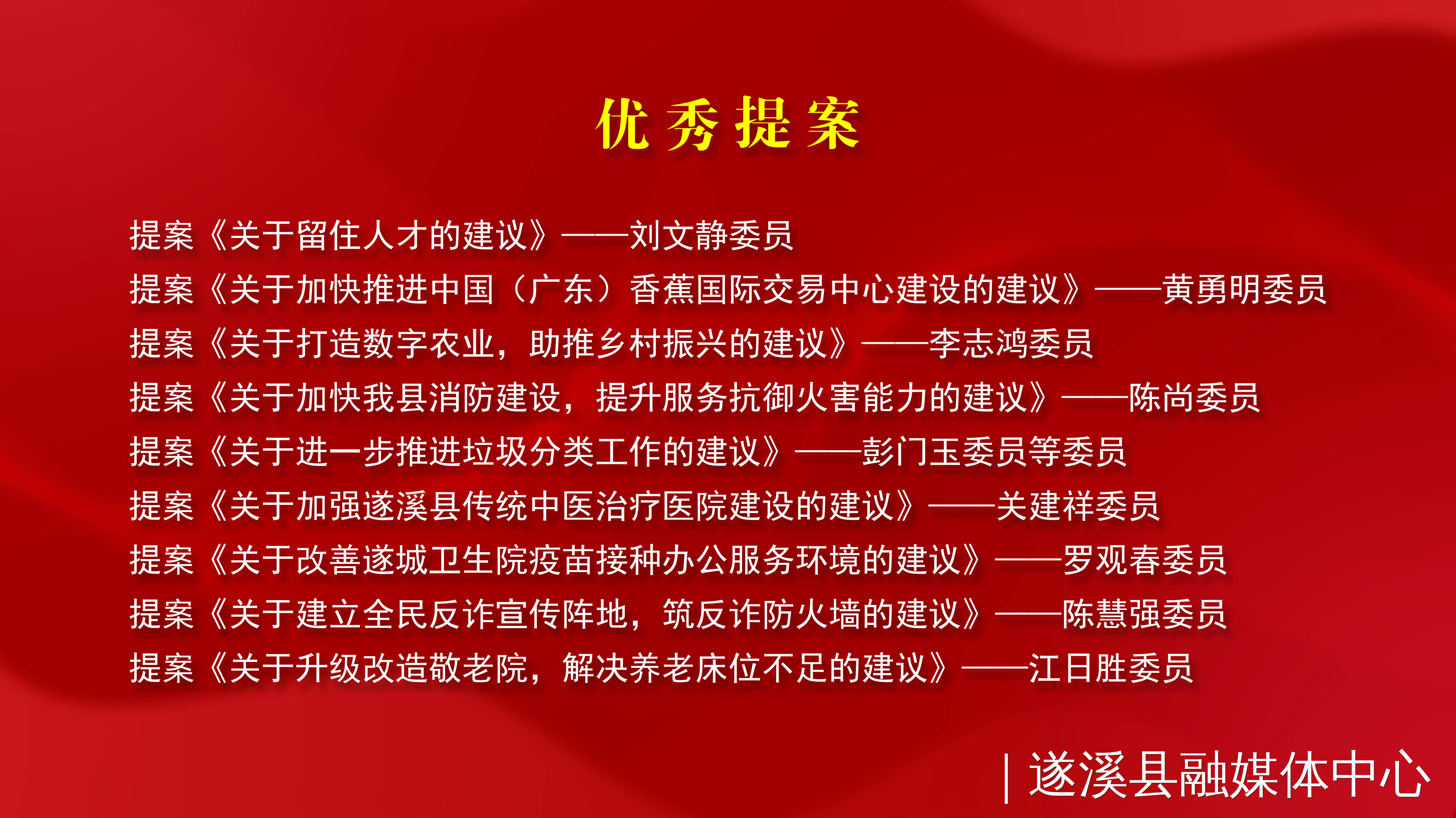 会议对《关于留住人才的建议》等9件优秀提案,中共遂溪县委组织部等9个提案承办先进单位进行了表彰。
