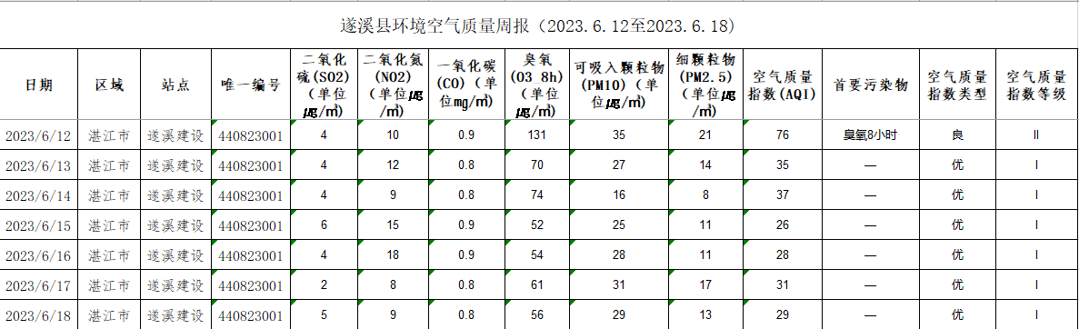 遂溪县环境空气质量周报(2023.6.12至2023.6.18)