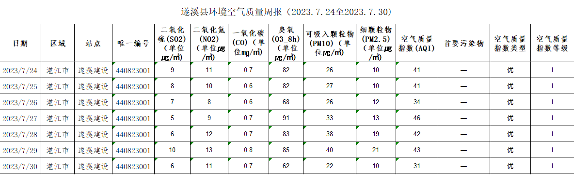 遂溪县环境空气质量周报(2023.7.24至2023.7.30)