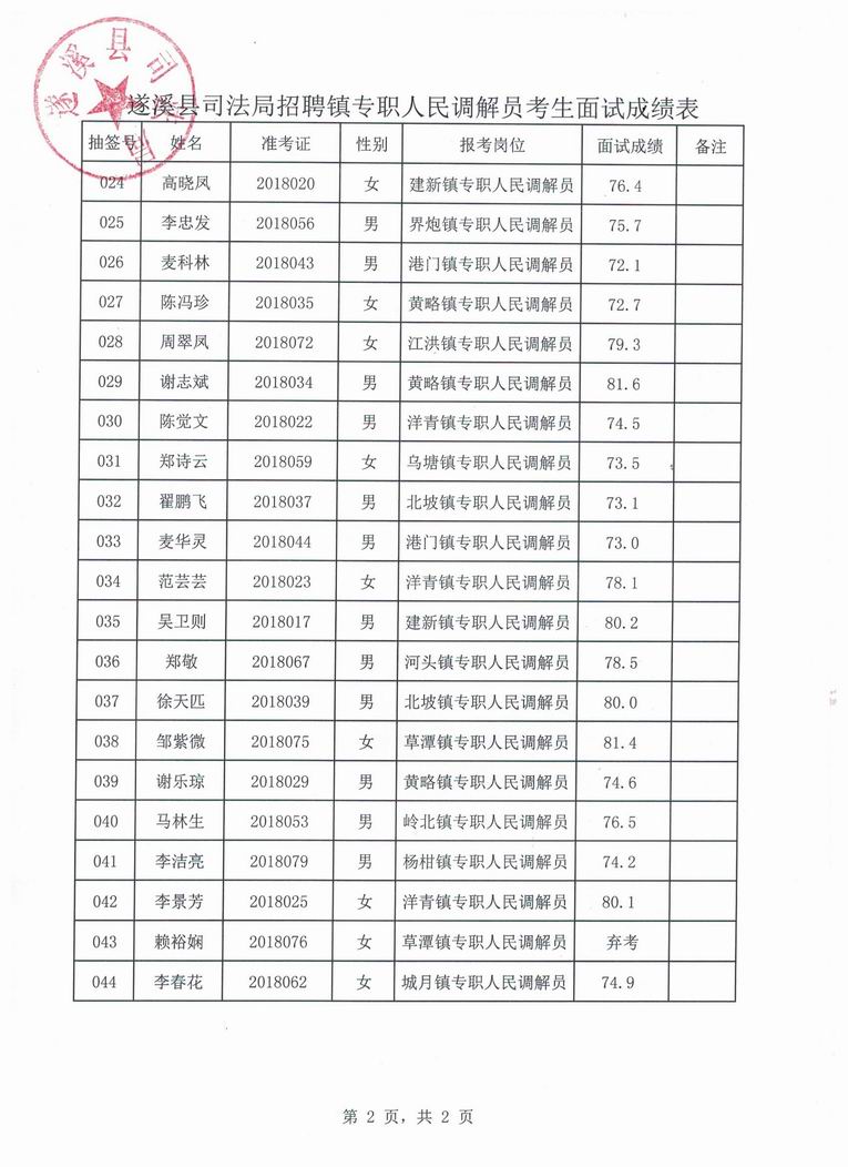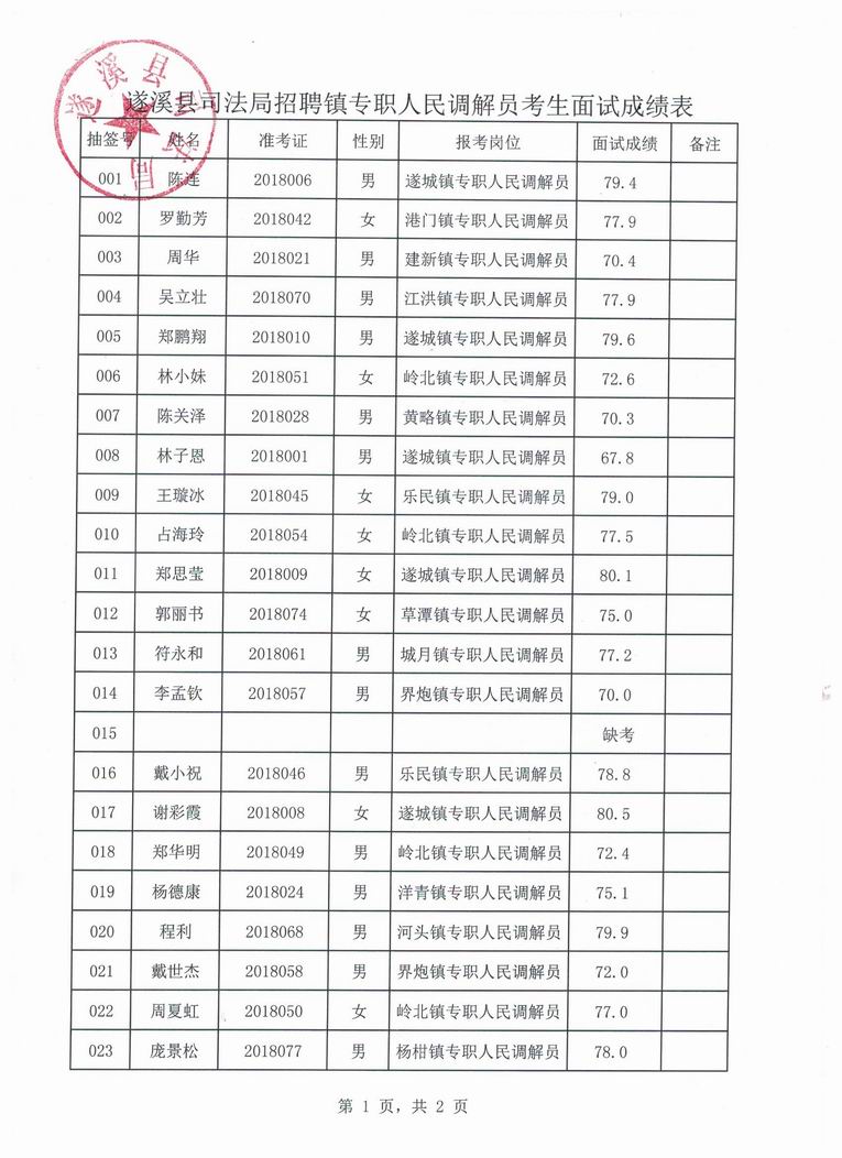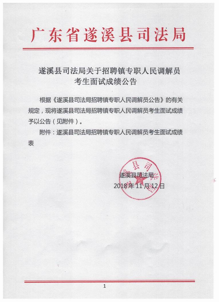 遂溪县司法局关于招聘镇专职人民调解员考生面试成绩公告