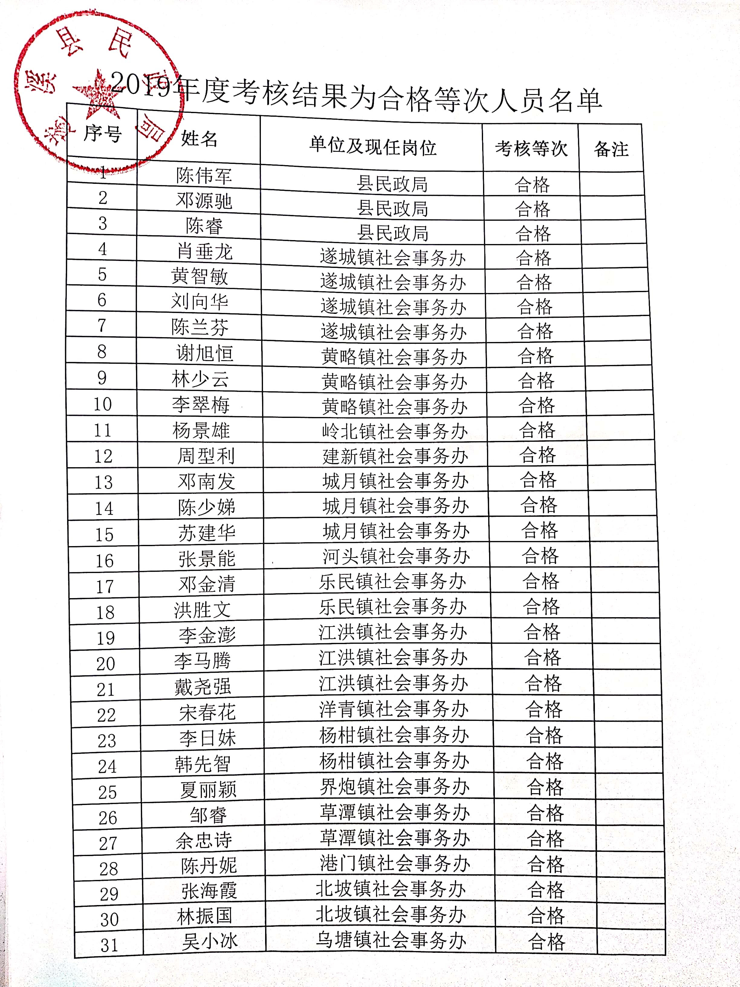 遂溪县民政局关于2019年度考核结果为合格等次人员的公示