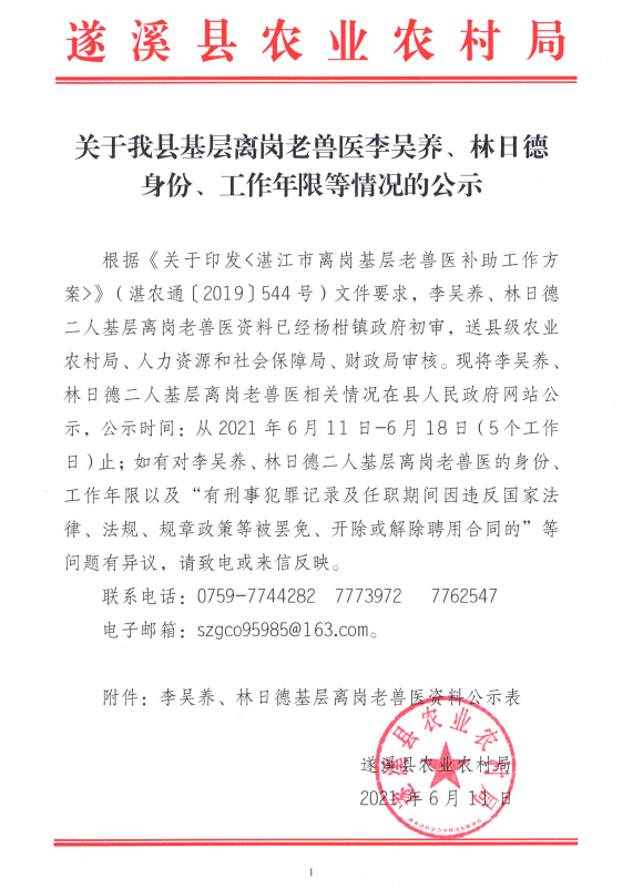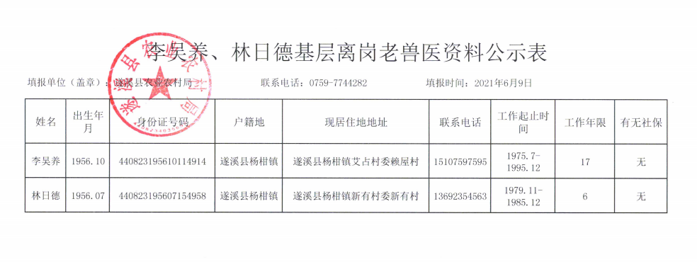 关于我县基层离岗老兽医李吴养、林日德身份、工作年限等情况的公示