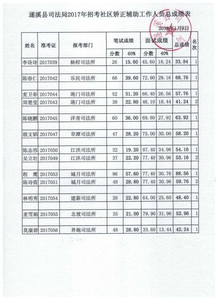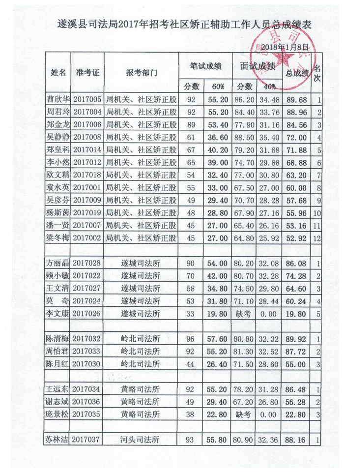 遂溪县司法局2017年招考社区矫正辅助工作人员总成绩公布