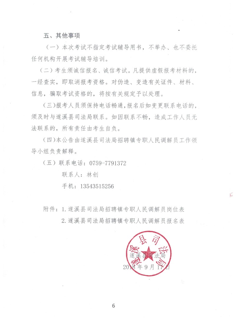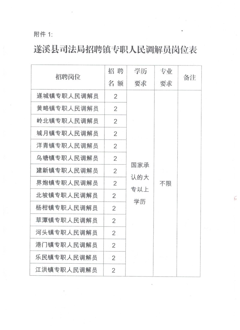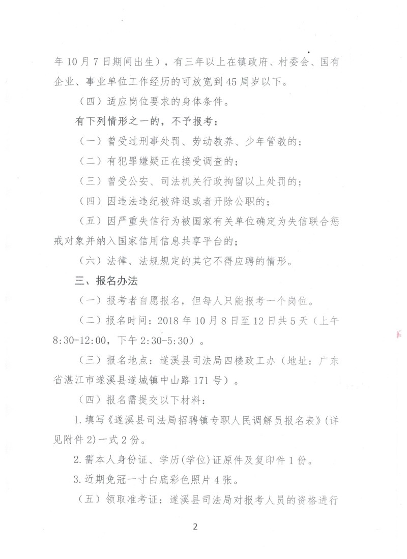 遂溪县司法局招聘镇专职人民调解员公告 | | 作者:县司法局 | 来源:县司法局 | 时间:2018-09-17 17:52:26 点击数:- 附件1:遂溪县司法局招聘镇专职人民调解员岗位表 附件2:遂溪县司法局招聘镇专职人民调解员报名表 【打印正文】