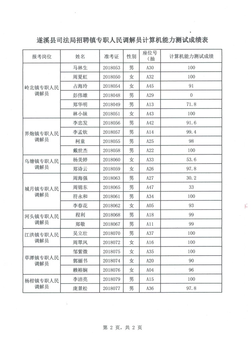 关于遂溪县司法局招聘镇专职人民调解员计算机能力测试成绩的公告