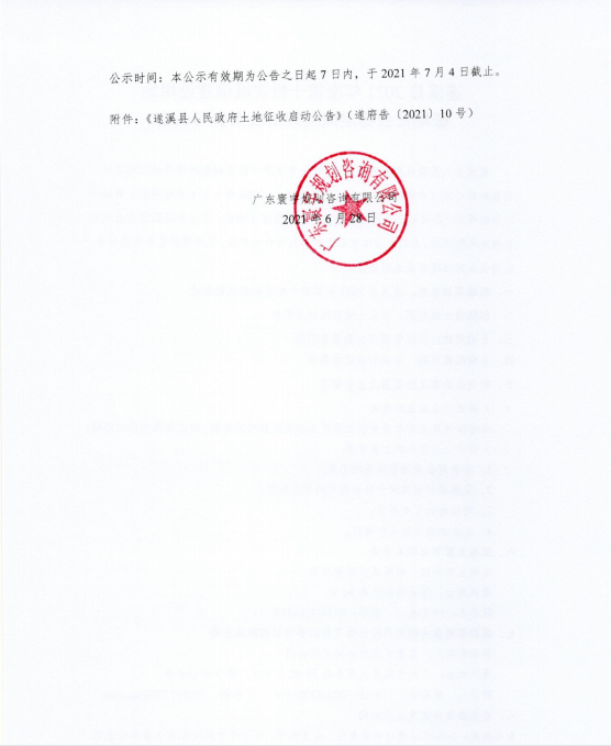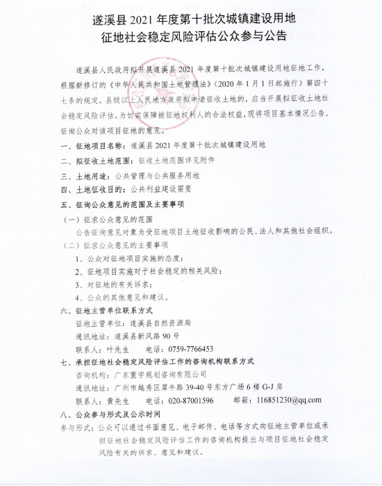 遂溪县2021年度第十批次城镇建设用地征地社会稳定风险评估公众参与公告 | | 作者: | 来源:遂溪县自然资源局 | 时间:2021-06-28 17:36:59 点击数:- 附件:遂溪县人民政府土地征收启动公告遂府告〔2021〕10号.PDF 【打印正文】