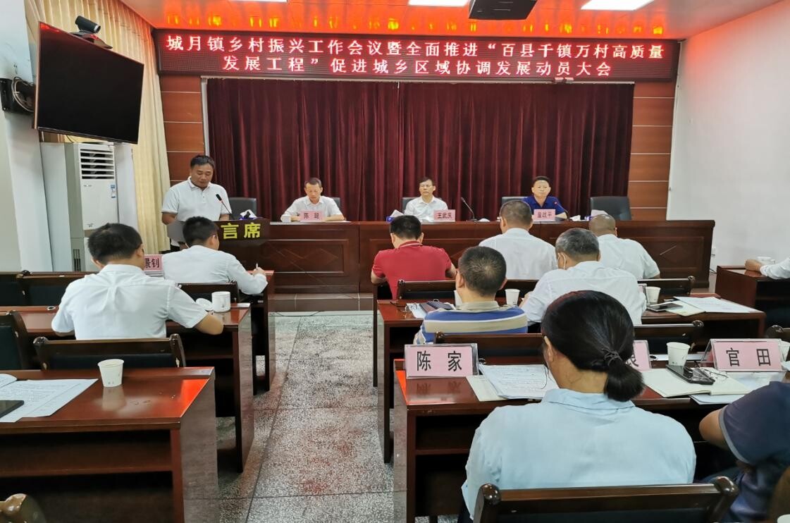 为进一步做好乡村振兴迎检工作,积极响应县级深入实施“百县千镇万村高质量发展工程”的部署要求,开创城乡区域协调发展新局面,2023年5月11日,城月镇召开乡村振兴工作会议暨全面推进“百县千镇万村高质量发展工程”促进城乡区域协调发展动员大会。会议由镇委副书记詹战平主持,镇领导班子成员(含主任科员)、各村(社区)支部书记、驻镇帮镇扶村工作队全体成员、各下乡工作组组长参加会议。