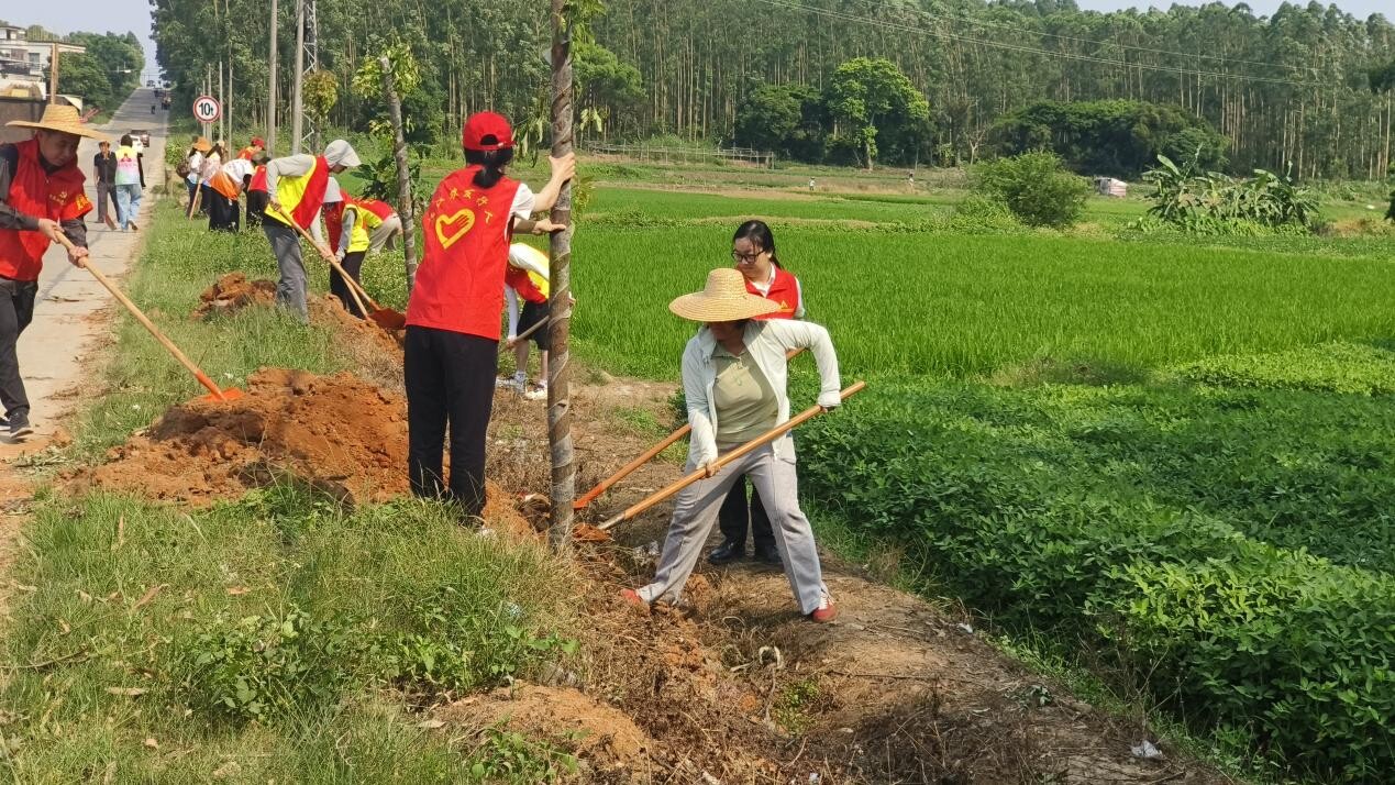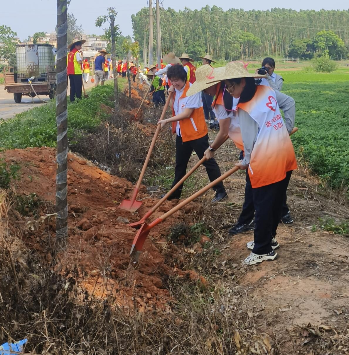 活动中,志愿者们身着马甲手握铁锹、锄头等工作沿着扶良村城月至官田Y664道路两旁迅速投入到植树中。大家一起挥锹铲土、培土围堰、提水浇灌,每道工序一丝不苟、认真细致。参加活动领导边植树,边了解香樟树苗品种、生长周期等情况,要求加强后续养护,确保成活、成林、成景,积极引导广大青年参与到绿美广东生态建设中,持续增加绿量,不断提升乡村绿化管理水平。经过一番热火朝天的劳动,一棵棵生机盎然的香樟树苗迎风挺立,生机勃勃。