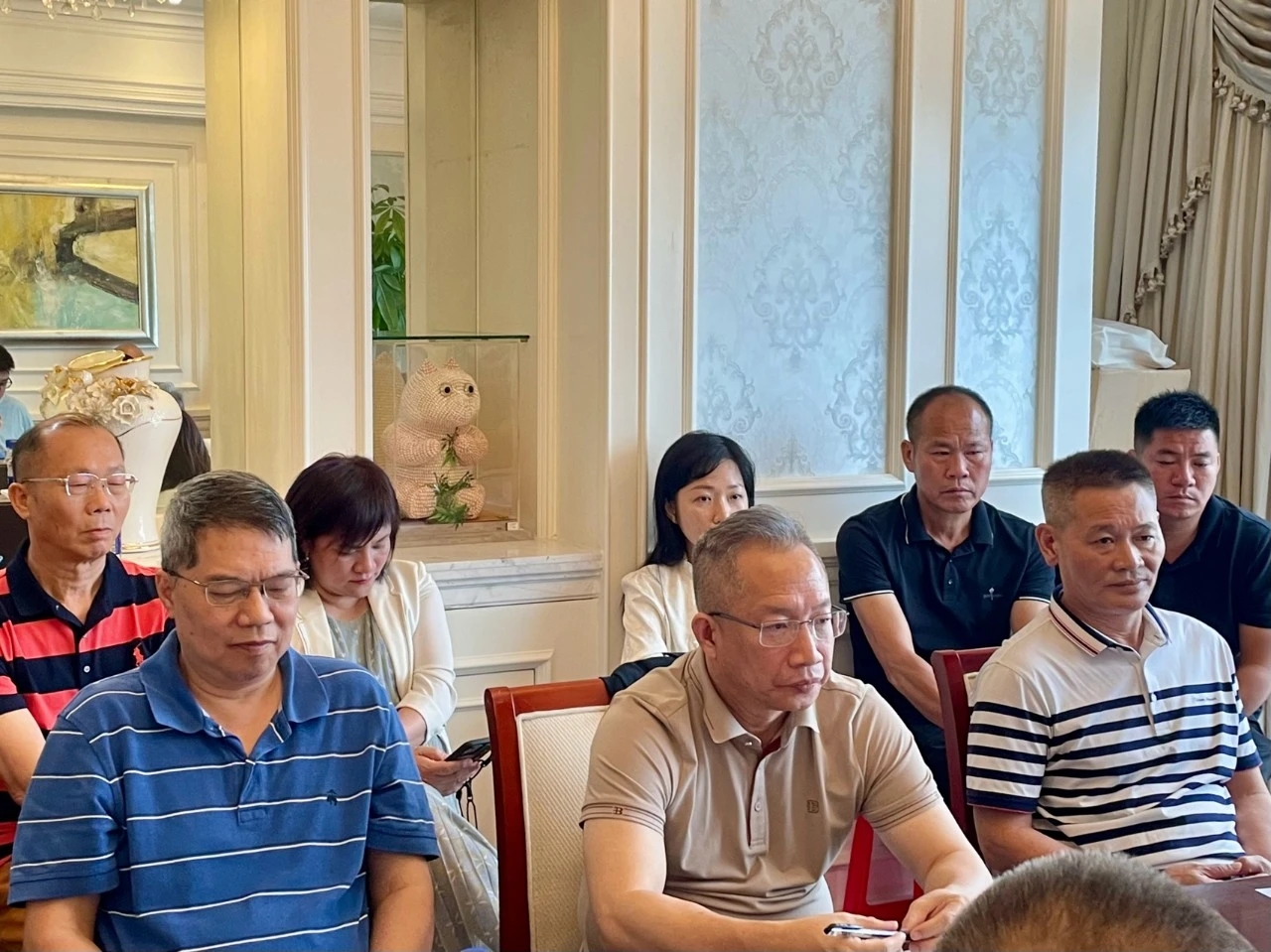 随后,王武庆书记进行了发言。王书记说明了此次到访商会的目的和任务:一是响应县政府的工作进行招商引资,二是为城月镇教育促进会募集资金。王书记详细介绍了城月镇近年的发展情况。城月镇目前总人口达13.8万人,有164条自然村,2023年生产总值超60亿元,综合实力位列湛江市各中心镇第9名。近年来为了贯彻落实市委市政府、县委县政府关于全面推进乡村振兴、“百县千镇万村高质量发展工程”、乡村绿化等工作部署以及遂溪县“美丽庭院”建设工作推进会要求,城月镇着力提升镇容镇貌,对全镇的交通主干道、排水设施、卫生秩序进行了改造升级,为进一步优化营商环境提供了良好的硬件条件。接下来,会进一步健全招商引资工作体系,欢迎广大乡贤为城月镇的振兴发展出谋划策,回乡投资。