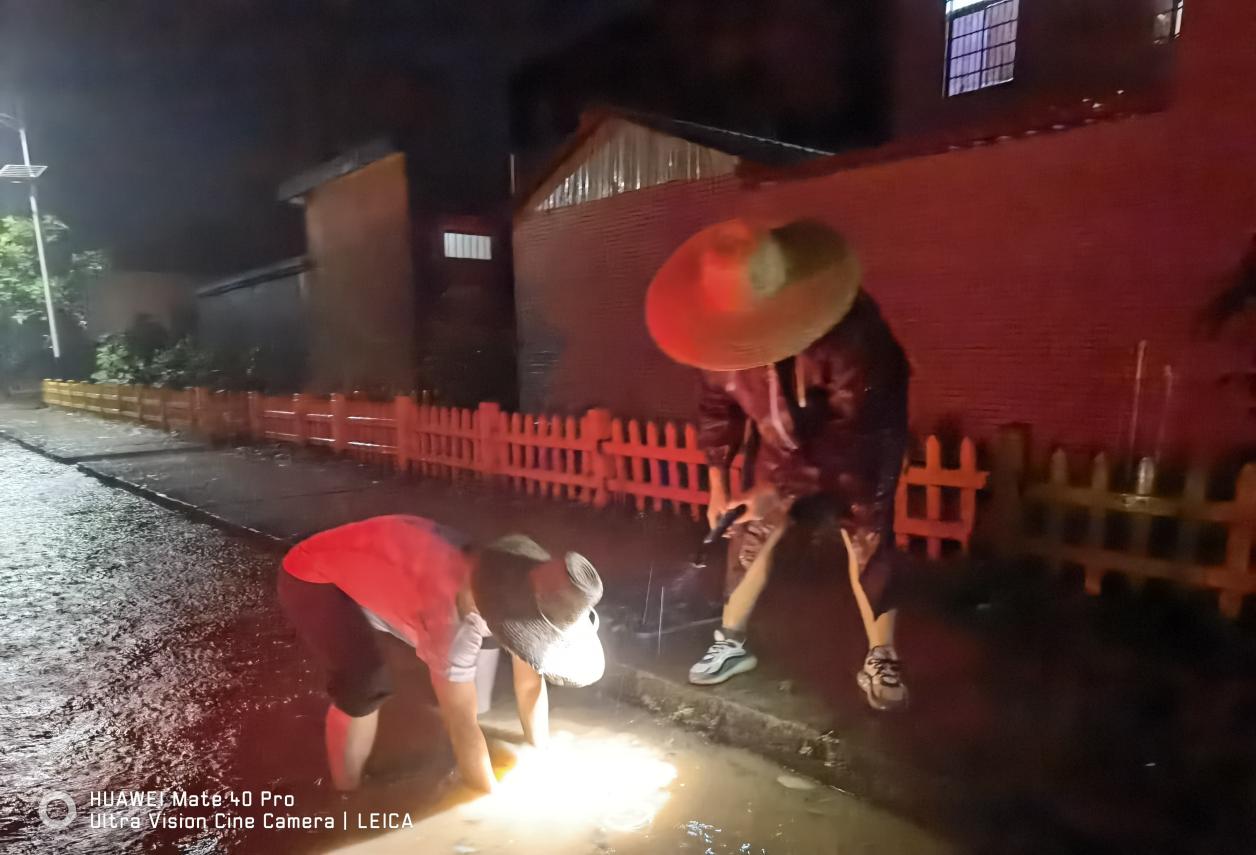 陈家村党员突击队巡查时,发现环村路出现积水的情况,在陈家村临时党支部书记欧薇薇的带领下,党员突击队及时清理排水口处的垃圾、淤泥、落叶等杂物,进一步防止内涝。
