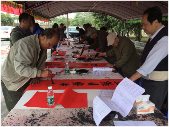 活动现场,书法家们泼墨挥毫,贫困户们有秩序地排队领取心仪红春联。本次活动深受贫困户欢迎。