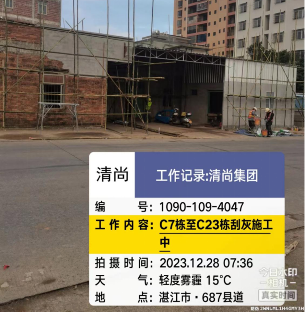 (九)清尚集团对县道X687路段(圩镇中心十字路口口至城里小学)外立面改造项目进行施工。今日派出施工人员20人。已完成绞手架搭建15栋,外立面围墙批灰2440平方米。