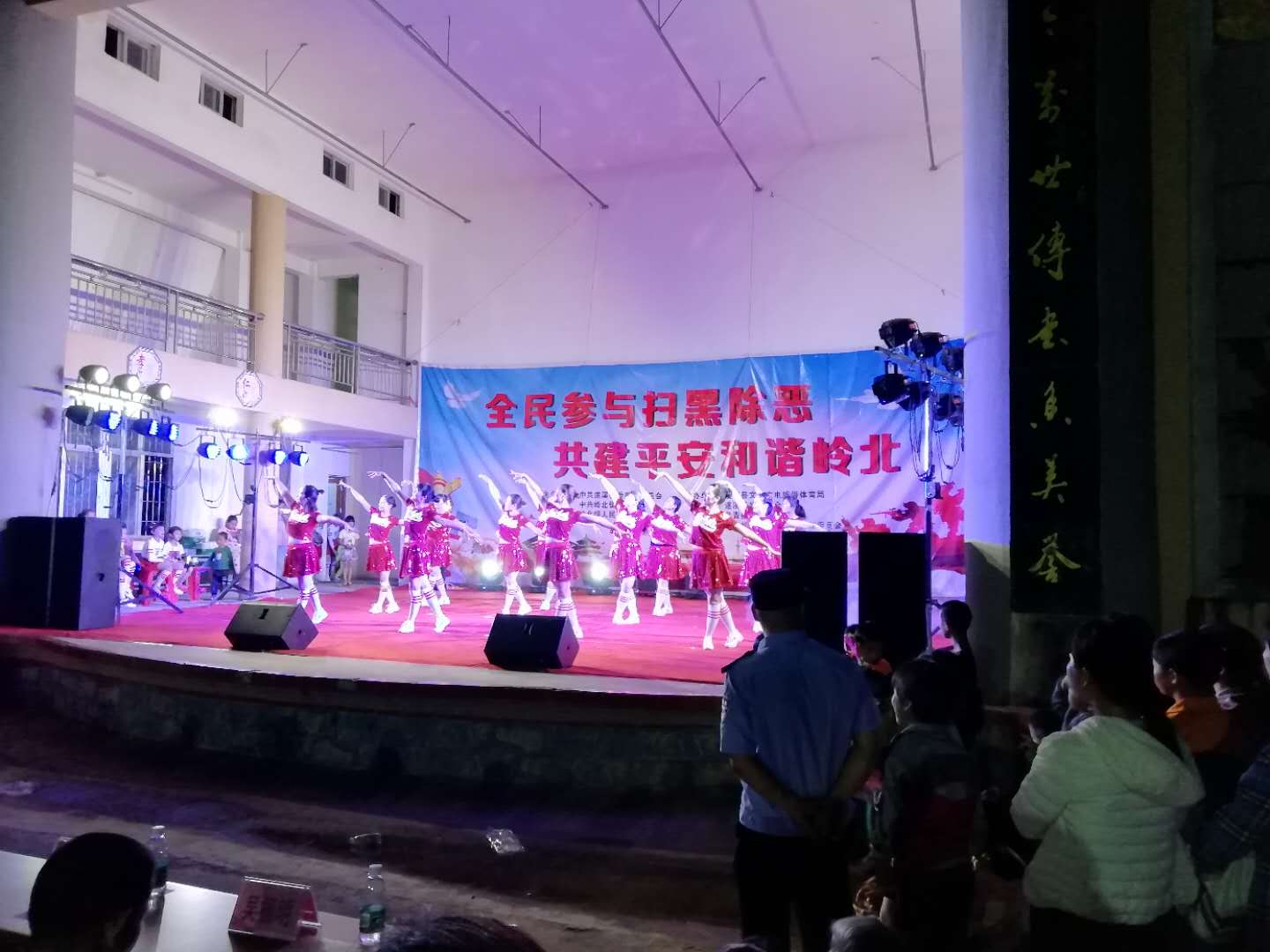 陈华夺在演出致辞中表示,送戏下乡文艺演出活动旨在丰富人民群众的业余文化生活和宣传扫黑除恶平安和谐建设工作,希望大家一起携手坚决打赢扫黑除恶专项斗争的硬仗,打造共建、共享的社会治安格局,营造风清气正人民安居乐业的美丽、平安、和谐的岭北。文艺晚会在舞蹈《我和我的祖国》中拉开了帷幕学生手语表演《和你一样》及朗诵《无邪教》指出从小做起一名学法,懂法,守法,用法护法的好学生。《点赞新时代》表达了岭北镇党委政府扫黑除恶专项斗争工作已深入民心,更加安定祥和,大家共同走进美好新时代,轻快有趣的快板、美仑美焕的舞蹈,将扫黑除恶平安建设工作与地方特色文艺演出形式进行结合,赢得观众阵阵掌声。