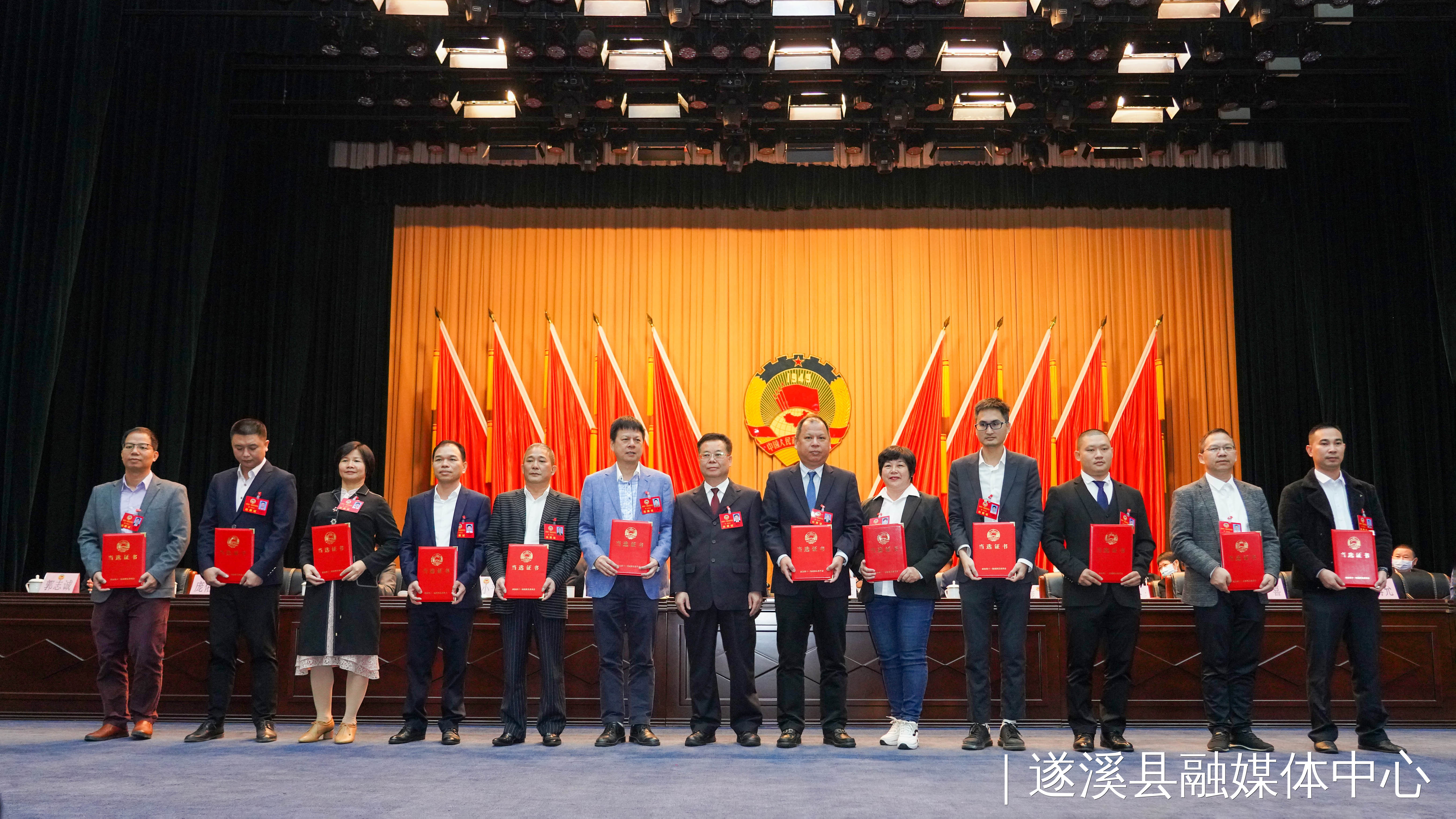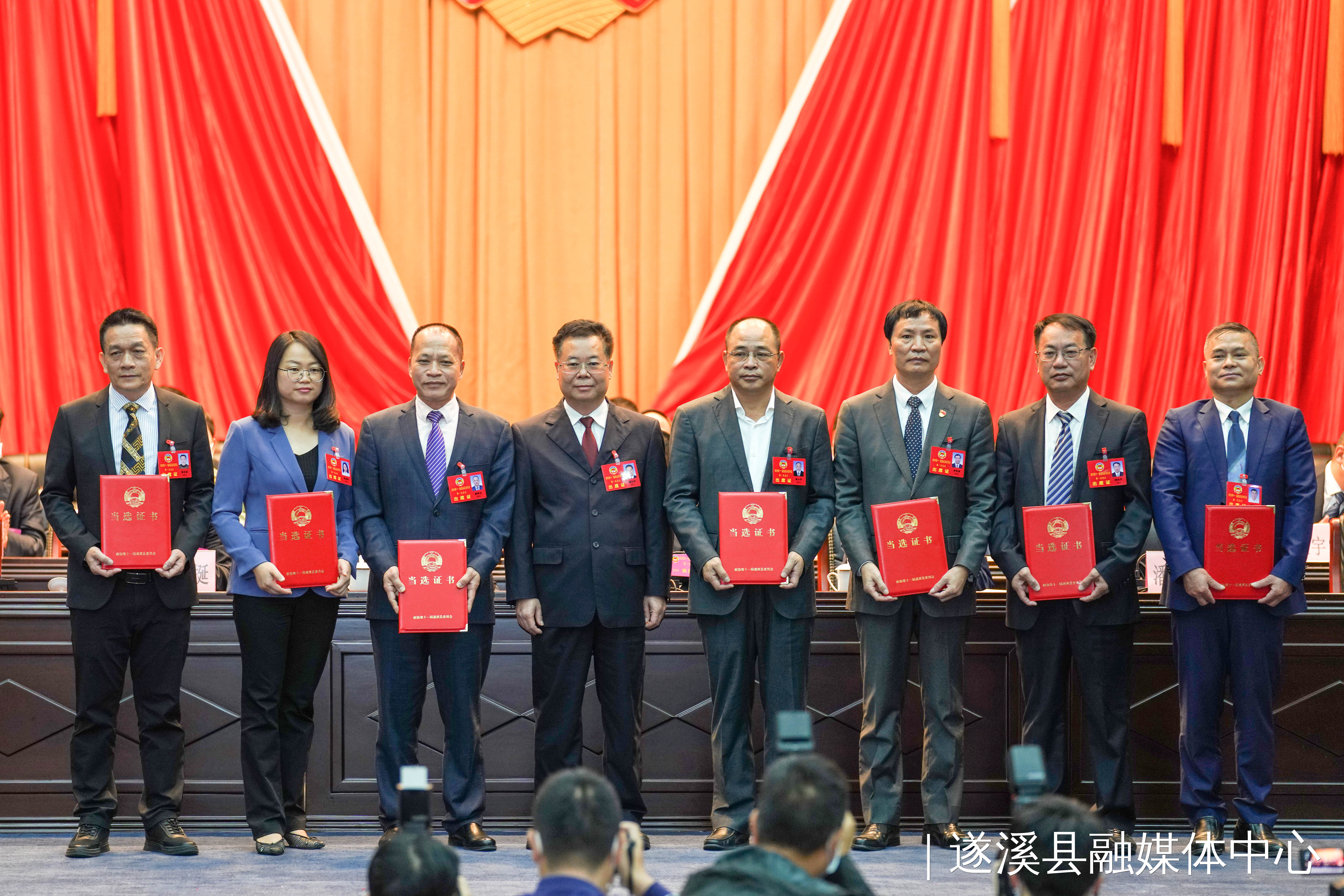 遂溪县政协主席潘汝权为新当选的政协第十一届遂溪县委员会副主席黄小平、姚博允、李和清、陈丽珺、庞佑仔、李实秋,秘书长郭志诚,及王睿等42名常务委员颁发当选证书。