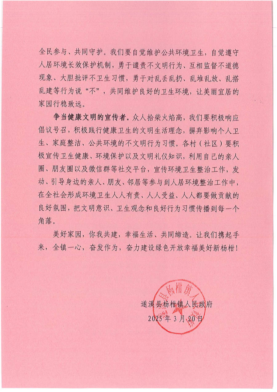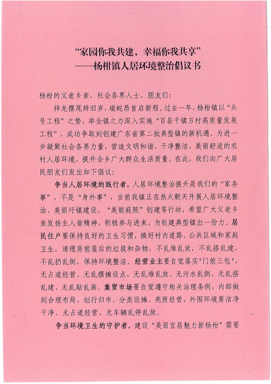 家园你我共建,幸福你我共享”——杨柑镇人居环境整治倡议书