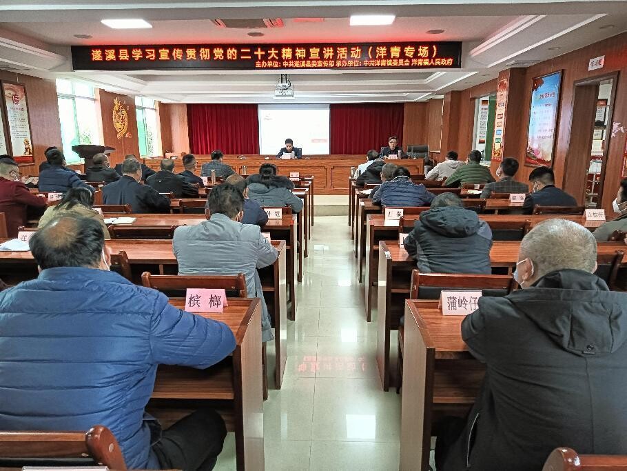 为乡村振兴助力》的宣讲报告。宣讲报告会由洋青镇党委书记陈武主持。洋青镇领导班子,各村(居)党支部书记或主任、各机关事业单位负责人、镇中层以上干部等参加宣讲会。