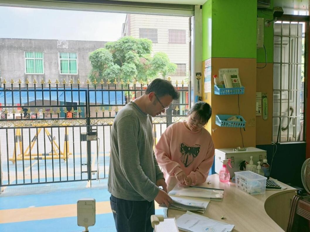 图为公共服务办检查幼儿园入园、晨检登记表