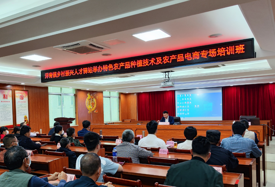 为进一步提升农产品种植技术和广大群众科技致富水平,培养农村新型技术人才,不断激发农村创业活力,拓宽农产品销售渠道,全力助力乡村振兴,2023年3月27日,洋青镇在五楼会议室举办乡村振兴人才培训班暨特色农产品种植技术、农产品电商培训专场。本次培训邀请了华南农业大学园艺学院副院长、研究生导师陈杰忠,湛江市电商产业园运营总监、湛江市众晟创新科技有限责任公司首席运营官黄思源莅临讲课。培训由镇党委副书记、镇长陈荣庆主持,镇党委副书记、驻镇帮镇扶村工作队队长庞国泉、镇党委副书记何望禄、镇党委委员梁利、镇党委委员陈剑波出席会议,镇农业农村办、农业技术服务中心、驻镇帮镇扶村工作队、各村(居)分管农业干部、种植大户、脱贫户等100余人参加培训。