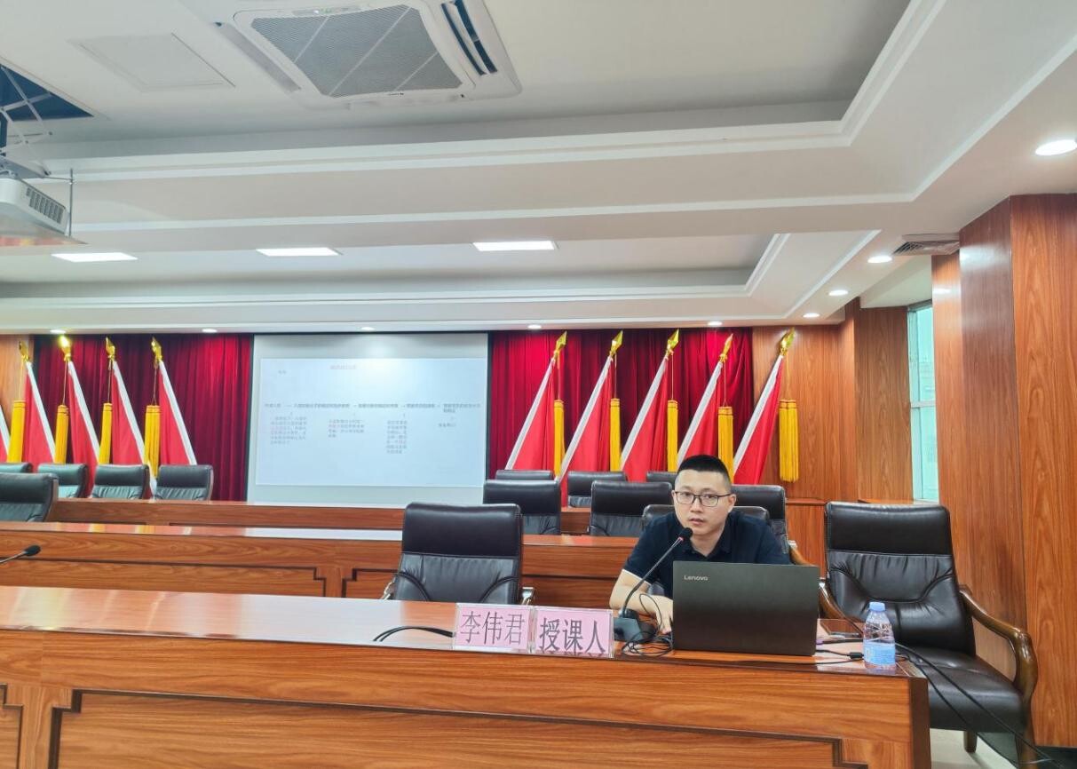 图为县委组织部党建指导中心驻洋青镇党建指导员李伟君为学员授课