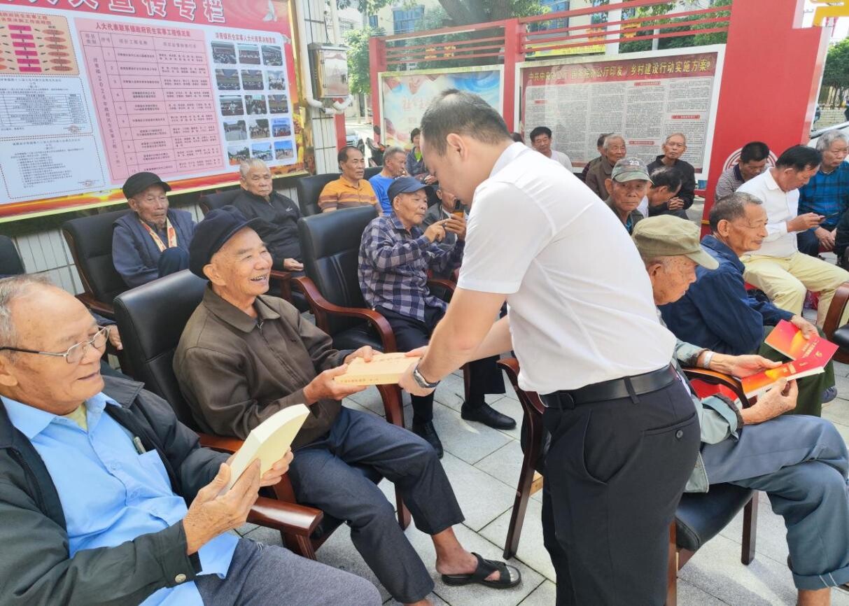 图为镇党委副书记何望禄发放学习书籍