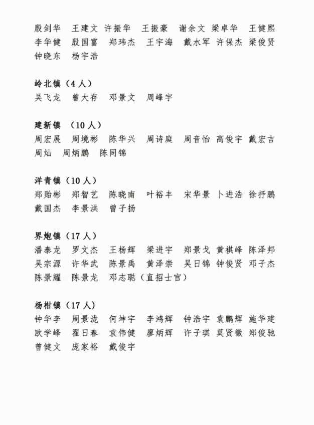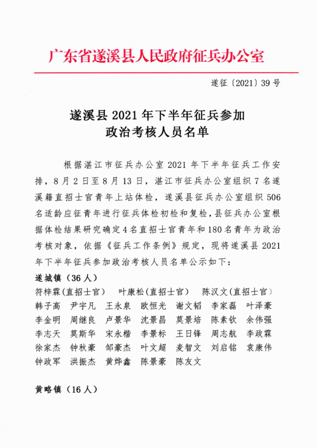 遂溪县2021年下半年征兵参加政治考核人员名单