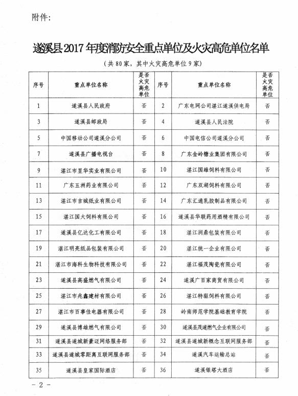 关于调整遂溪县2017年度消防安全重点单位及火灾高危单位的通知
