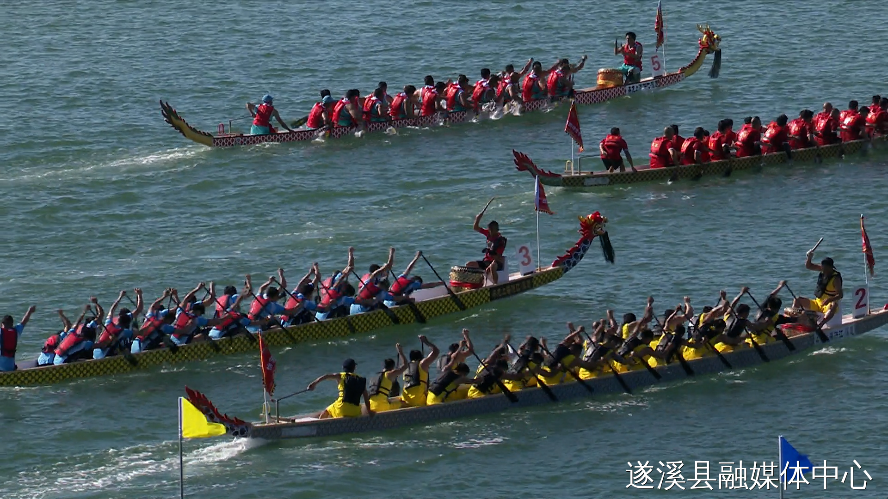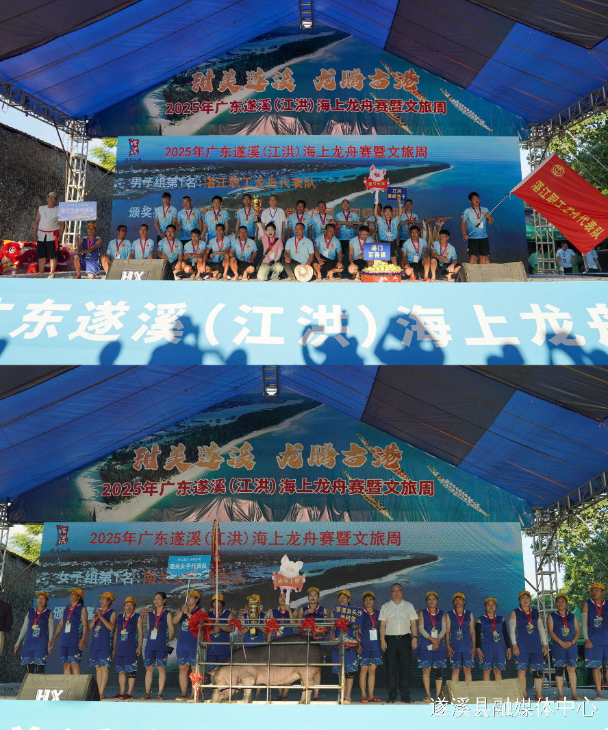 启动仪式后,海上龙舟赛正式拉开帷幕。江洪古港浪涛奔涌,13支龙舟如离弦之箭劈波斩浪——12支来自遂溪县的代表队与1支广西融安代表队,其中男队10支,女队3支,以桨为剑、以鼓为号,在碧海蓝天间展开一场速度与激情的巅峰对决。最终,男子组湛江职工代表队展现出强劲实力,获得男子组第一名,四联代表队获得男子组第二名,坛头代表队获得男子组第三名。南关代表队获得女子组第一名。