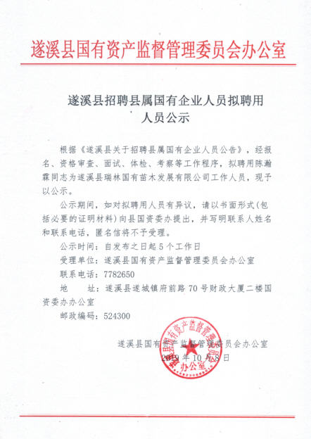 遂溪县关于招聘县属国有企业人员拟聘用人员公示