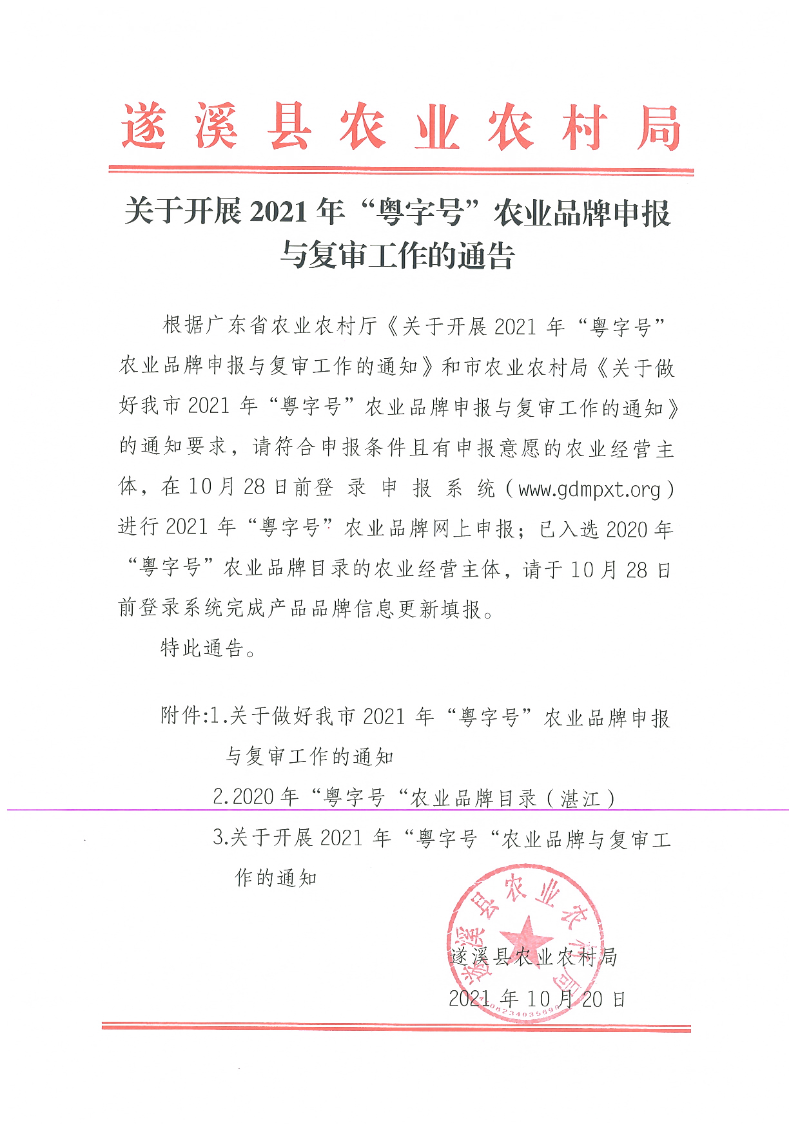 关于开展2021年“粤字号”农业品牌申报与复审工作的通告 | | 作者: | 来源:本网 | 时间:2021-10-20 11:35:26 点击数:- 附件:关于开展2021年“粤字号”农业品牌申报与复审工作的通告.pdf1:关于做好我市2021年“粤字号”农业品牌申报与复审工作的通知.pdf2:2020年“粤字号”农业品牌目录(湛江).xls3:关于开展2021年“粤字号”农业品牌申报与复审工作的通知.pdf.pdf 【打印正文】