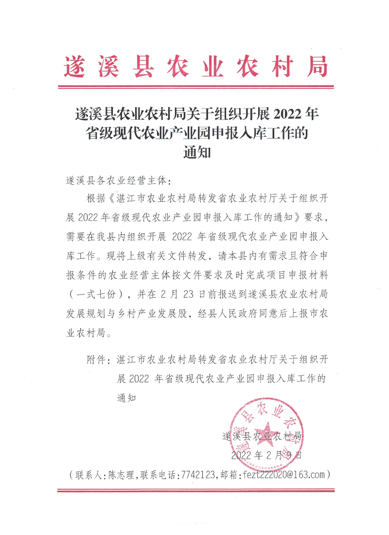 遂溪县农业农村局关于组织开展2022年省级现代农业产业园申报入库工作的通知 | | 作者: | 来源:本网 | 时间:2022-02-09 09:57:02 点击数:- 附件:湛江市农业农村局转发省农业农村厅关于组织开展2022年省级现代农业产业园申报入库工作的通知.pdf 【打印正文】