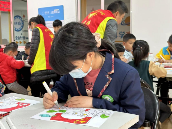随后,志愿者与孩子们进行绘画创作。孩子们充分发挥各自的想象力,用鲜艳活泼的色彩描绘出他们心中对祖国的定义。一幅幅充满童趣、充满幻想、富有活力的画面跃然纸上,用稚嫩的画笔展示了他们眼中的社会主义核心价值观,活动现场其乐融融。