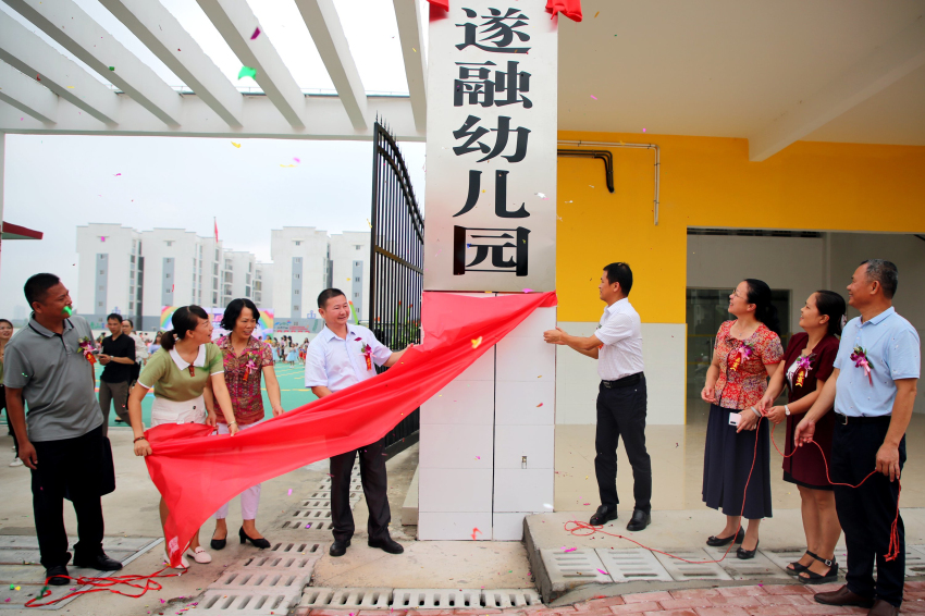 投入1400万元广东财政帮扶资金援建的遂融幼儿园是融安异地搬迁配套项目,占地面积16亩,规划建设27个教学班,可接纳约800名幼儿入园(其中一期接纳270名),一期工程于2018年9月开工建设,2019年7月正式竣工, 9月2日开园开学,截至9月10日已安排267名学前适龄儿童入园,其中融安县四个易地扶贫搬迁安置点的学前适龄儿童160名。作为易地扶贫搬迁融城、康欣两个安置小区的配套项目,遂融幼儿园在优化配置教育资源、推动教育均衡发展方面作用显著,极大地满足了融安县四个易地扶贫搬迁安置点和周边村屯学前适龄儿童的入园需求,切实解决了搬迁贫困户子女入学难问题,保证搬迁户子女教育有保障。