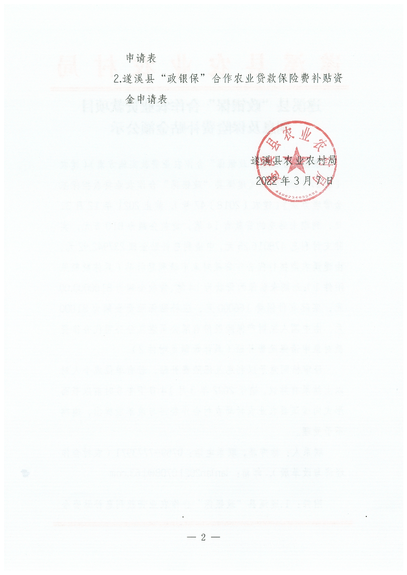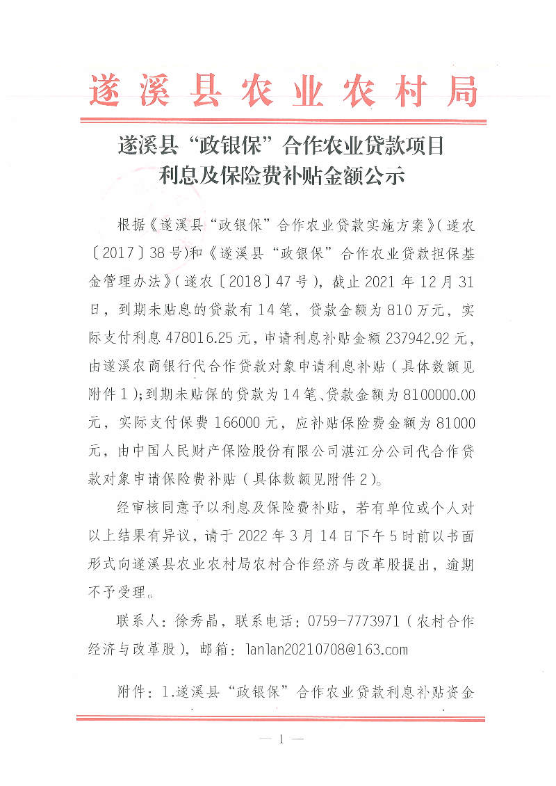 遂溪县“政银保”合作农业贷款项目利息及保险费补贴金额公示 | | 作者: | 来源:本网 | 时间:2022-03-07 09:48:49 点击数:- 附件:1.遂溪县“政银保”合作农业贷款利息补贴资金申请表.xlsx2.遂溪县“政银保”合作农业贷款保险费补贴资金申请表 .xlsx 【打印正文】