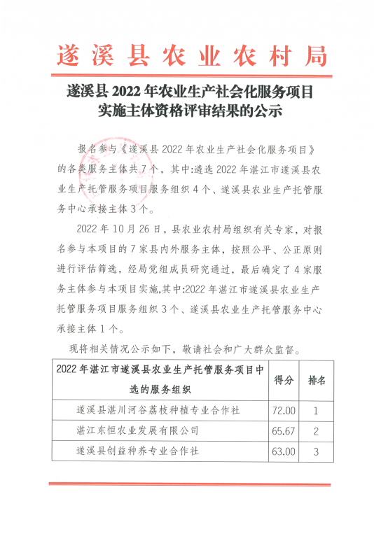 遂溪县2022年农业生产社会化服务项目实施主体资格评审结果公示